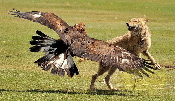 Даже такой сильный зверь, как волк, не в состоянии выдержать напора и мощи когтей беркута, когда тот держит его за загривок или спину. Испуганный и потерявший ориентацию хищник лишается возможности сопротивляться. Своим острым клювом птица выкалывает волку глаза, и когда люди добегают до места схватки, они видят поверженную добычу, на спине которого гордо восседает крылатый охотник. Им остается только добить жертву ножом.