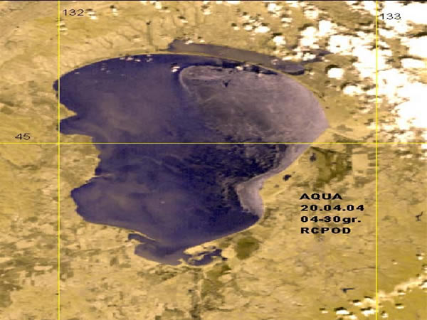 Оценка состояния ледового покрова на озере Ханка в апреле 2004 года, на основе спутниковой информации спектрорадиометра MODIS со спутников Terra и Aqua. 9.04.04. – озеро полностью покрыто льдом. 20.04.04 – 20% озера покрыто льдом. 28.04.04 – озеро полностью очистилось ото льда.