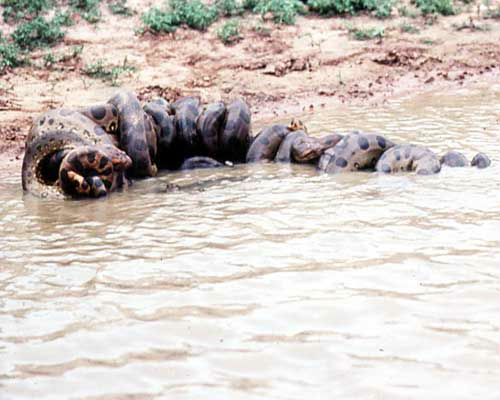 Если же водоем пересыхает, анаконде приходится находить себе другой, но когда засуха настигает все водоемы, эта закапывается в ил и впадает в состояние оцепенения, только так ей удается дожить до нового сезона дождей.