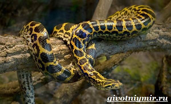 Анаконда Южной Америки – самая крупная в мире змея семейства удавовых. При встрече с ней у человека холодеет кровь и появляется парализующий члены страх. Сильное извивающееся тело змеи способно задушить любого, кто стоит у нее на пути, даже взрослого быка. И неудивительно, самая длинная змея в мире может сравниться с автобусом. Ее вес, в отдельных случаях, достигает массы трех взрослых мужчин.