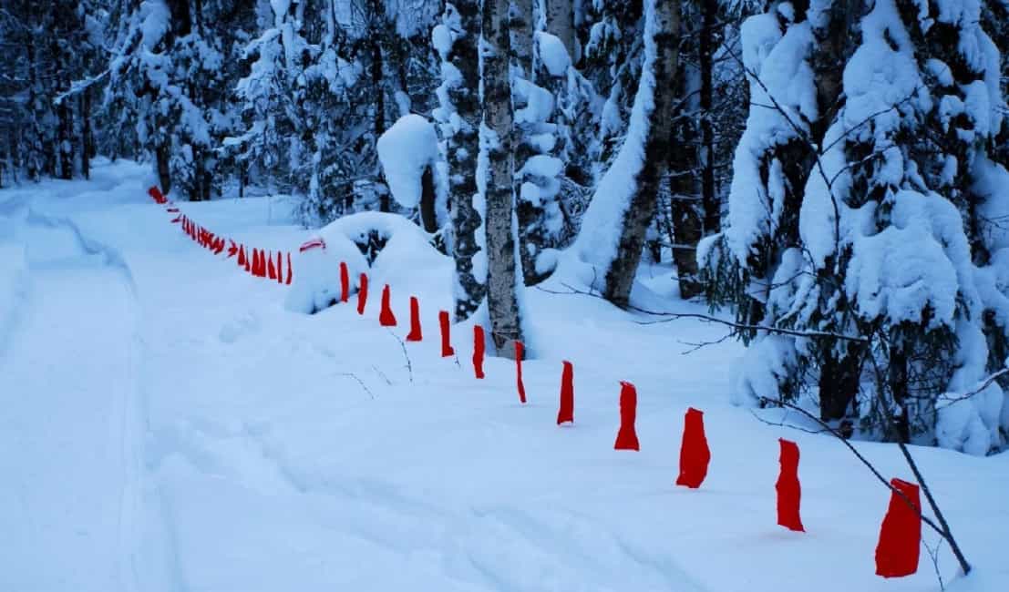 Обычно для охоты требуется около двух километров флажков. Натягивают их, раскручивая с барабана, почти над самой землей, но не касаясь поверхности. Флажки отпугивают как трепыханием на ветру ярких красных кусков ткани, так и своим искусственным запахом.