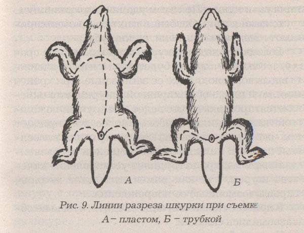 Снимают шкуру пластом по кругу, обрезая лапки вокруг