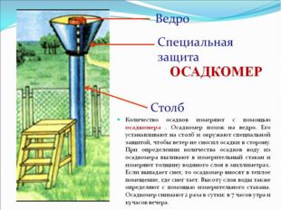 Осадкомер Дождемер; Плювиометр Осадкомер - прибор для сбора и измерения количества выпавших атмосферных осадков. Осадкомер представляет собой цилиндрическое ведро строго определенного сечения, устанавливаемое на метеоплощадке . Количество осадков определяется путем сливания попавших в ведро осадков в специальный дождемерный стакан, площадь сечения которого также известна. Твердые осадки (снег, крупа, град) предварительно растапливаются. Конструкция осадкомера предусматривает защиту от быстрого испарения осадков и от выдувания попавшего в ведро осадкомера снега.