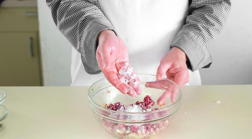 Добавляем 1 сырое яйцо и несколько щепоток соли.