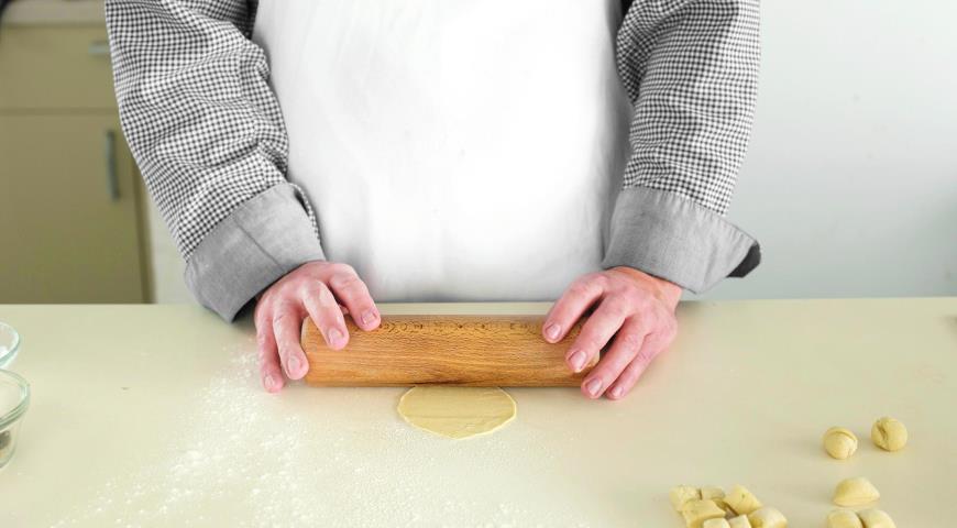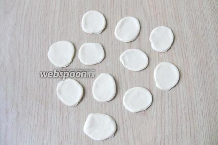 От теста отрезаем небольшие куски, которые раскатываем в тонкий пласт. Рюмкой вырезаем из пласта кружки.