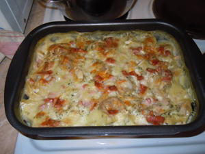 2. Выложим ветчину,всё это заливаем смесью,посыпаем сыром.