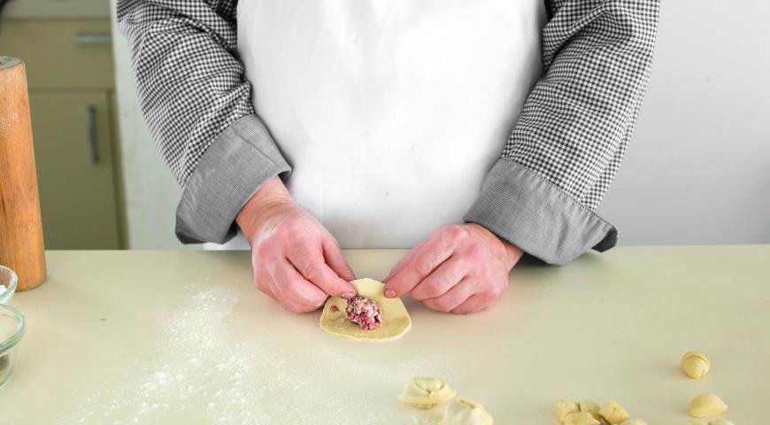 В каждый кружок кладем чайную ложку мясного фарша. Сначала кружок с фаршем защипываем, как вареник. А затем соединяем концы. Получается пельмень.