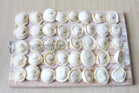 Готовые пельмени уложите на поднос, не забыв присыпать его мукой. Если вам нужно, чтобы пельмешки некоторое время полежали в холодильнике, постелите там полиэтиленовую пленку и разложите их так, чтобы они не соприкасались между собой. Один слой пельменей покрываете пленкой и на нее кладете следующий и т. д.