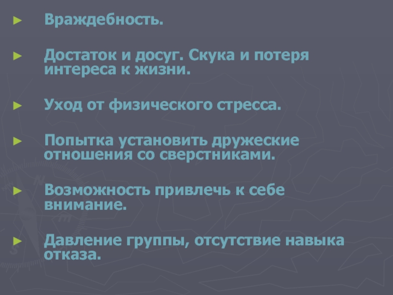 Давление группы, отсутствие навыка отказа.