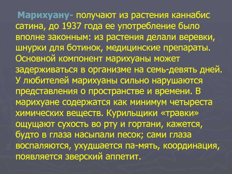 Марихуану- получают из растения каннабис сатина, до 1937 года ее употребление было вполне законным: из растения делали веревки, шнурки для ботинок, медицинские препараты. Основной компонент марихуаны может задерживаться в организме на семь-девять дней. У любителей марихуаны сильно нарушаются представления о пространстве и времени. В марихуане содержатся как минимум четыреста химических веществ. Курильщики «травки» ощущают сухость во рту и гортани, кажется, будто в глаза насыпали песок; сами глаза воспаляются, ухудшается память, координация, появляется зверский аппетит.