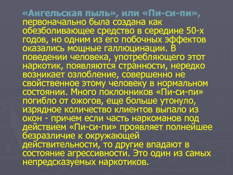 «Ангельская пыль», или «Пи-си-пи», первоначально была создана как обезболивающее средство в середине 50-х годов, но одним из его побочных эффектов оказались мощные галлюцинации. В поведении человека, употребляющего этот наркотик, появляются странности, нередко возникает озлобление, совершенно не свойственное этому человеку в нормальном состоянии. Много поклонников «Пи-си-пи» погибло от ожогов, еще больше утонуло, изрядное количество клиентов выпало из окон - причем если часть наркоманов под действием «Пи-си-пи» проявляет полнейшее безразличие к окружающей действительности, то другие впадают в состояние агрессивности. Это один из самых непредсказуемых наркотиков.