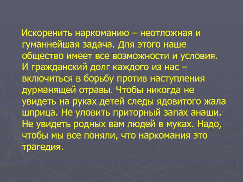 Искоренить наркоманию – неотложная и гуманнейшая задача. Для этого наше общество имеет все возможности и условия. И гражданский долг каждого из нас – включиться в борьбу против наступления дурманящей отравы. Чтобы никогда не увидеть на руках детей следы ядовитого жала шприца. Не уловить приторный запах анаши. Не увидеть родных вам людей в муках. Надо, чтобы мы все поняли, что наркомания это трагедия.