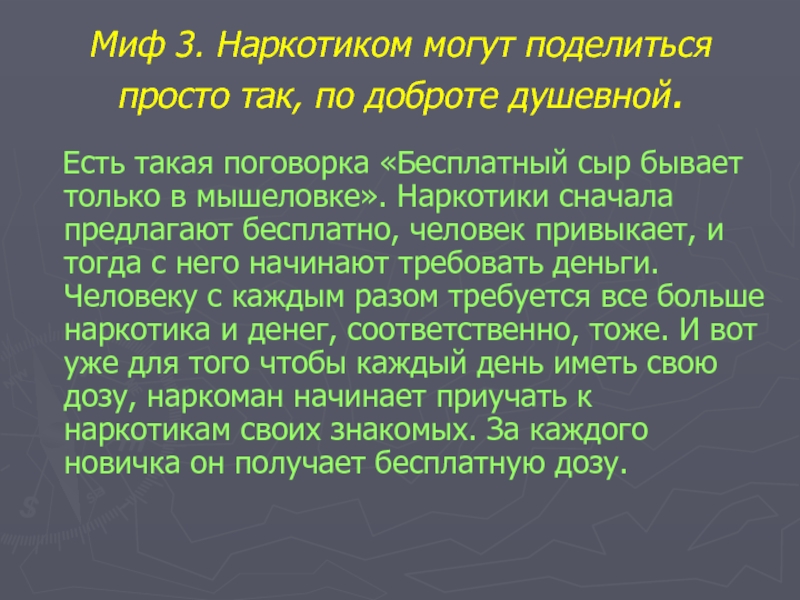 Есть такая поговорка «Бесплатный сыр бывает только в мышеловке». Наркотики сначала предлагают бесплатно, человек привыкает, и тогда с него начинают требовать деньги. Человеку с каждым разом требуется все больше наркотика и денег, соответственно, тоже. И вот уже для того чтобы каждый день иметь свою дозу, наркоман начинает приучать к наркотикам своих знакомых. За каждого новичка он получает бесплатную дозу.