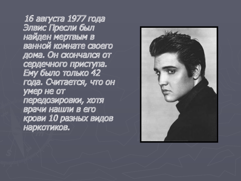16 августа 1977 года Элвис Пресли был найден мертвым в ванной комнате своего дома. Он скончался от сердечного приступа. Ему было только 42 года. Считается, что он умер не от передозировки, хотя врачи нашли в его крови 10 разных видов наркотиков.