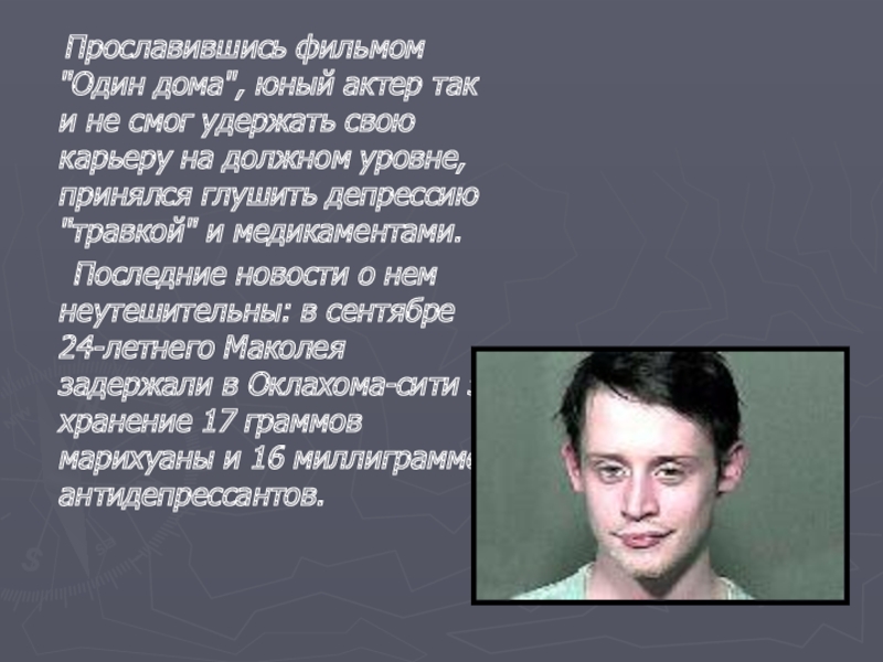 Последние новости о нем неутешительны: в сентябре 24-летнего Маколея задержали в Оклахома-сити за хранение 17 граммов марихуаны и 16 миллиграммов антидепрессантов.