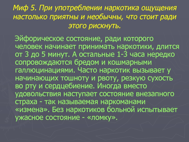 Миф 5. При употреблении наркотика ощущения настолько приятны и необычны, что стоит ради этого рискнуть.