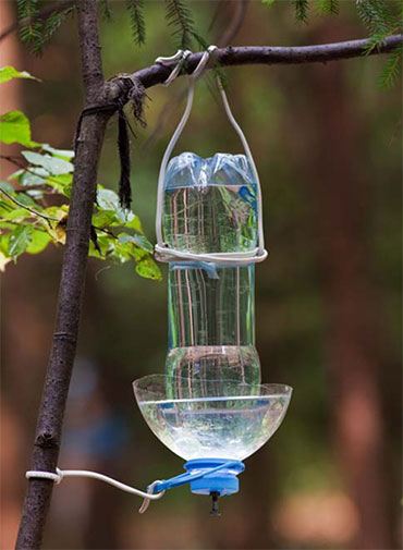 Зимой птицы особенно нуждаются в незамерзшей воде. Поэтому соорудите для них поилку. Способов соорудить простейшую поилку своими руками множество. Самый простой – совместить разрезанные части 2-х и 5-ти литровых бутылок и собрать примерно такую конструкцию.