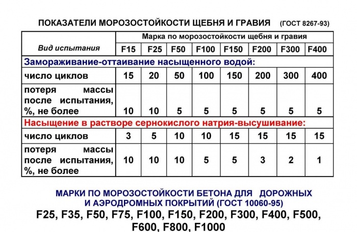 Морозостойкость – показатель (марка), говорящий о том, сколько раз щебень способен пережить заморозку и оттаивание без потери качественных свойств. Обозначается он буквой «F» и цифрой. Цифра – не что иное как количество циклов заморозки-оттаивания.