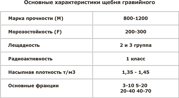 Плюсом гравийного материала является низкий процент лещадности фракции, который достигает 17% в пиковом значении. Низкий процент лещадности необходим для высокой насыпной плотности материала. Если добыча гравия происходит в экологически чистом месте, то он относится к безопасной группе, т. к. способен поглощать излучение, а не отдавать его. Средняя плотность материала - 2,4 тонны на кубический метр. Насыпная ниже и равняется 1,6 тонны на кубический метр. Фракции гравийного щебня обладают плотной структурой, поэтому не поглощает влагу, что повышает морозостойкость.