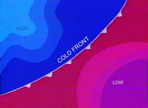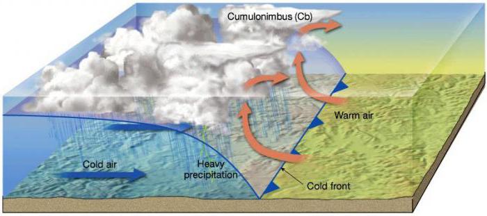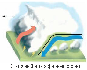 Если фронт перемещается в сторону более высоких температур, это означает, что наступает холодный воздух. Такой фронт называется холодным. При его наступлении тяжелые холодные воздушные массы вытесняют вверх более легкие теплые воздушные массы, которые, поднимаясь вверх, охлаждаются, влага, содержащаяся в них, высвобождается и образует . Непосредственное приближение холодного фронта можно заметить по скоплению мощных кучево-дождевых облаков на . Они быстро надвигаются стеной и вскоре занимают все небо. Нижний их край настолько низок, что, кажется, влачится по земле. Ослепительно белая кудрявая верхушка поднимается на высоту свыше 10 км. В природе становится тихо и душно, природа замирает. Вскоре ветер начинает дуть порывами, резко меняет направление. Внезапно обрушивается стена проливного дождя, нередко с градом. Потемневшее небо перечеркивают молнии, раздаются оглушительные раскаты грома. Ненастье обычно длится недолго, редко более двух . После становится холоднее, так как пространство занимают холодные воздушные массы. После могут начаться обложные дожди, которые постепенно перейдут в моросящие. Далее будет зависеть от скорости наступления холодного фронта.