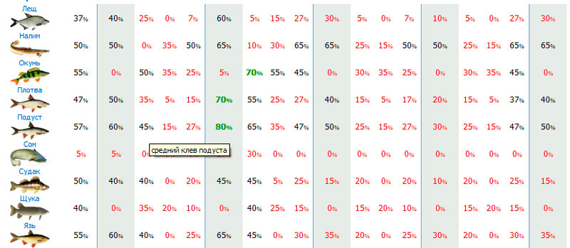 Красивая "универсальная" таблица с привязкой к погоде, подробный клев в % на ночь, утро, день и вечер - смотрится хорошо. Но методики нет – откуда прогноз, с потолка?