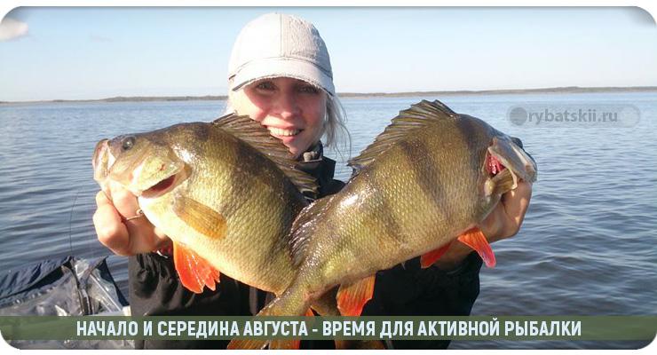 Окунь начинает интересоваться пищей. Поймать трофей возможно на удочку с боковым кивком. Он обитает вблизи осоки, кувшинок, недалеко от береговой растительности. В августе начинаются ночные заморозки, температура стремительно падает. Окунь предпочитает тепло, его активность может существенно упасть.