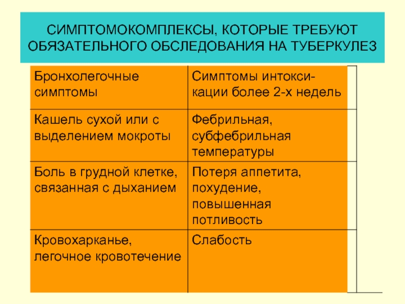 СИМПТОМОКОМПЛЕКСЫ, КОТОРЫЕ ТРЕБУЮТ ОБЯЗАТЕЛЬНОГО ОБСЛЕДОВАНИЯ НА ТУБЕРКУЛЕЗ