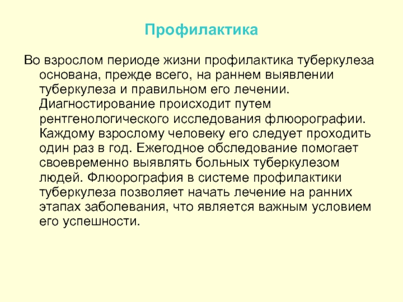 Во взрослом периоде жизни профилактика туберкулеза основана, прежде всего, на раннем выявлении туберкулеза и правильном его лечении. Диагностирование происходит путем рентгенологического исследования флюорографии. Каждому взрослому человеку его следует проходить один раз в год. Ежегодное обследование помогает своевременно выявлять больных туберкулезом людей. Флюорография в системе профилактики туберкулеза позволяет начать лечение на ранних этапах заболевания, что является важным условием его успешности.