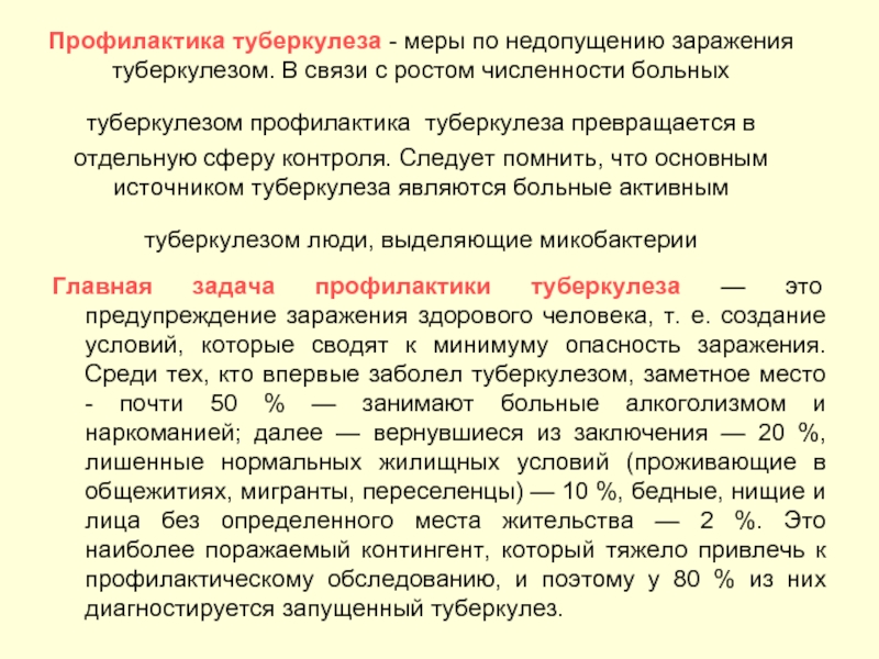 Главная задача профилактики туберкулеза — это предупреждение заражения здорового человека, т. е. создание условий, которые сводят к минимуму опасность заражения. Среди тех, кто впервые заболел туберкулезом, заметное место - почти 50 % — занимают больные алкоголизмом и наркоманией; далее — вернувшиеся из заключения — 20 %, лишенные нормальных жилищных условий (проживающие в общежитиях, мигранты, переселенцы) — 10 %, бедные, нищие и лица без определенного места жительства — 2 %. Это наиболее поражаемый контингент, который тяжело привлечь к профилактическому обследованию, и поэтому у 80 % из них диагностируется запущенный туберкулез.