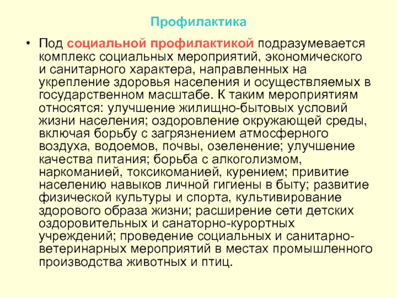Под социальной профилактикой подразумевается комплекс социальных мероприятий, экономического и санитарного характера, направленных на укрепление здоровья населения и осуществляемых в государственном масштабе. К таким мероприятиям относятся: улучшение жилищно-бытовых условий жизни населения; оздоровление окружающей среды, включая борьбу с загрязнением атмосферного воздуха, водоемов, почвы, озеленение; улучшение качества питания; борьба с алкоголизмом, наркоманией, токсикоманией, курением; привитие населению навыков личной гигиены в быту; развитие физической культуры и спорта, культивирование здорового образа жизни; расширение сети детских оздоровительных и санаторно-курортных учреждений; проведение социальных и санитарно-ветеринарных мероприятий в местах промышленного производства животных и птиц.