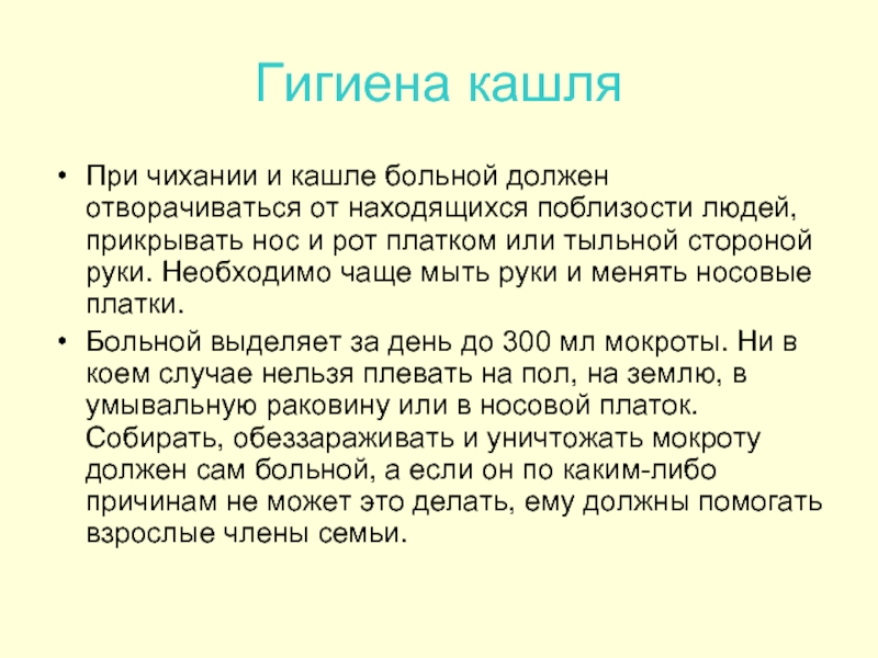 1. Больной должен соблюдать правила личной гигиены. Но не меньшее значение имеет грамотность в вопросах гигиены всех членов семьи и близких, проживающих в очаге туберкулеза.