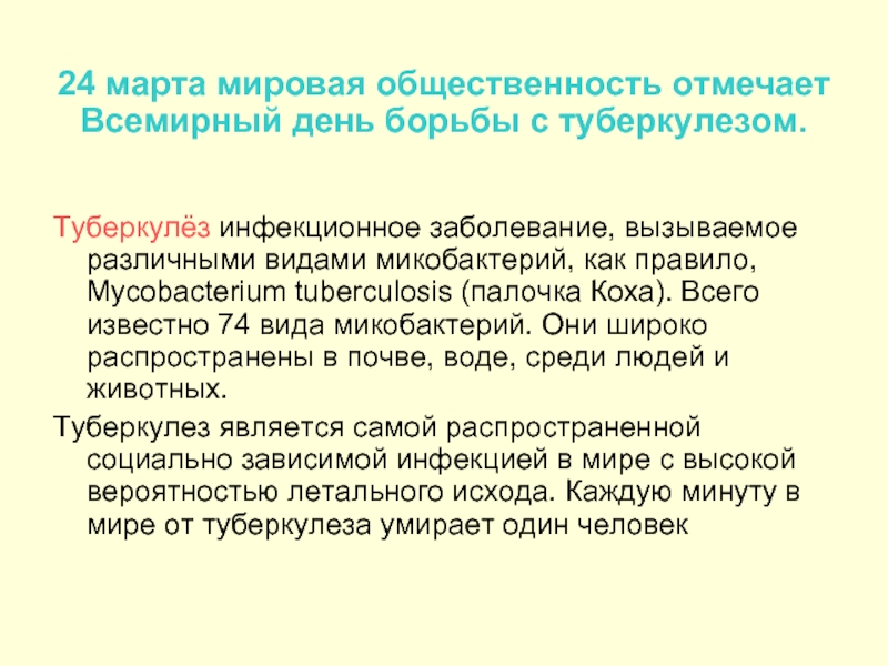 Туберкулёз инфекционное заболевание, вызываемое различными видами микобактерий, как правило, Mycobacterium tuberculosis (палочка Коха). Всего известно 74 вида микобактерий. Они широко распространены в почве, воде, среди людей и животных.