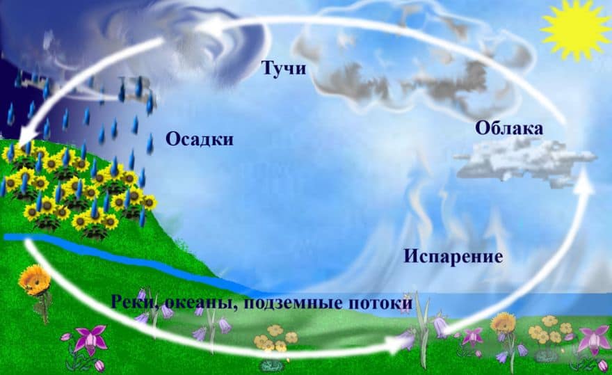 Это известный всем круговорот воды в природе. Его часто используют, чтобы описать путешествие жидкости снизу-вверх и обратно. Для появления дождя важно два момента: насыщение и слияние.