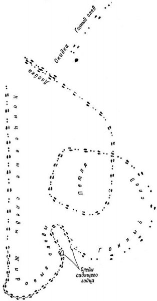 Наиболее популярный тип охоты. Суть в том, чтобы выследить зайца по следу. Старт данной охоте дает первый снег, так как следы можно увидеть только на нем. Начинающие охотники часто путают направление движения зверя и тропят в обратном направлении. Пример следа показан на рисунке.