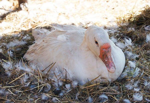 Если самка гуся начала вырывать собственный пух, следовательно, она начинает готовиться к высиживанию потомства. Гуси сами делают собственные гнезда. Прежде чем посадить наседку, гнездо необходимо продезинфицировать раствором каустика и выстлать соломой.