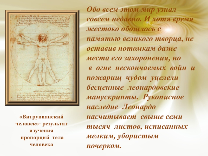 Обо всем этом мир узнал совсем недавно. И хотя время жестоко обошлось с памятью великого творца, не оставив потомкам даже места его захоронения, но в огне нескончаемых войн и пожарищ чудом уцелели бесценные леонардовские манускрипты. Рукописное наследие Леонардо насчитывает свыше семи тысяч листов, исписанных мелким, убористым почерком.