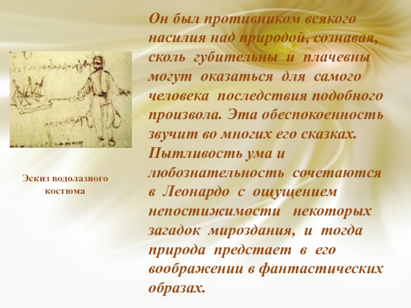 Он был противником всякого насилия над природой, сознавая, сколь губительны и плачевны могут оказаться для самого человека последствия подобного произвола. Эта обеспокоенность звучит во многих его сказках. Пытливость ума и любознательность сочетаются в Леонардо с ощущением непостижимости некоторых загадок мироздания, и тогда природа предстает в его воображении в фантастических образах.