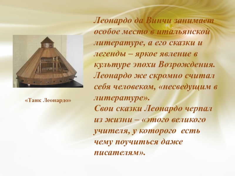 Леонардо да Винчи занимает особое место в итальянской литературе, а его сказки и легенды – яркое явление в культуре эпохи Возрождения. Леонардо же скромно считал себя человеком, «несведущим в литературе». Свои сказки Леонардо черпал из жизни – «этого великого учителя, у которого есть чему поучиться даже писателям».