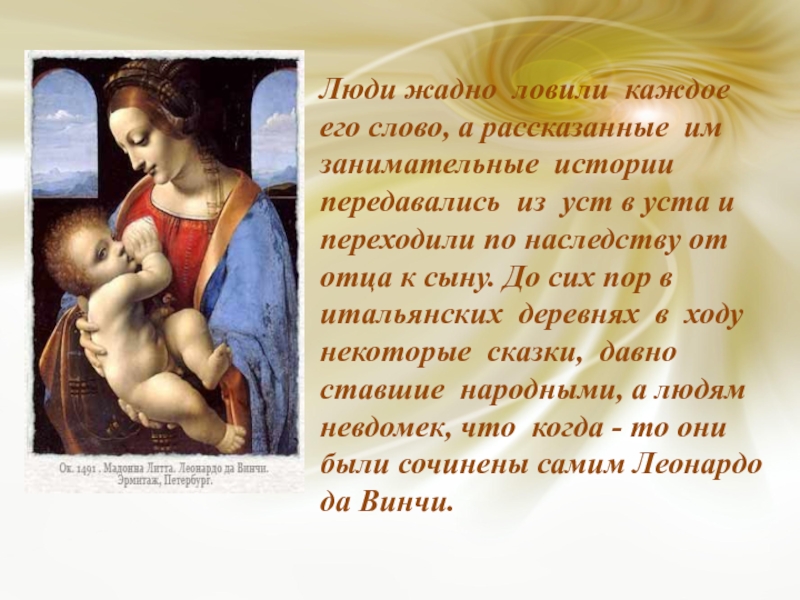 Люди жадно ловили каждое его слово, а рассказанные им занимательные истории передавались из уст в уста и переходили по наследству от отца к сыну. До сих пор в итальянских деревнях в ходу некоторые сказки, давно ставшие народными, а людям невдомек, что когда - то они были сочинены самим Леонардо да Винчи.
