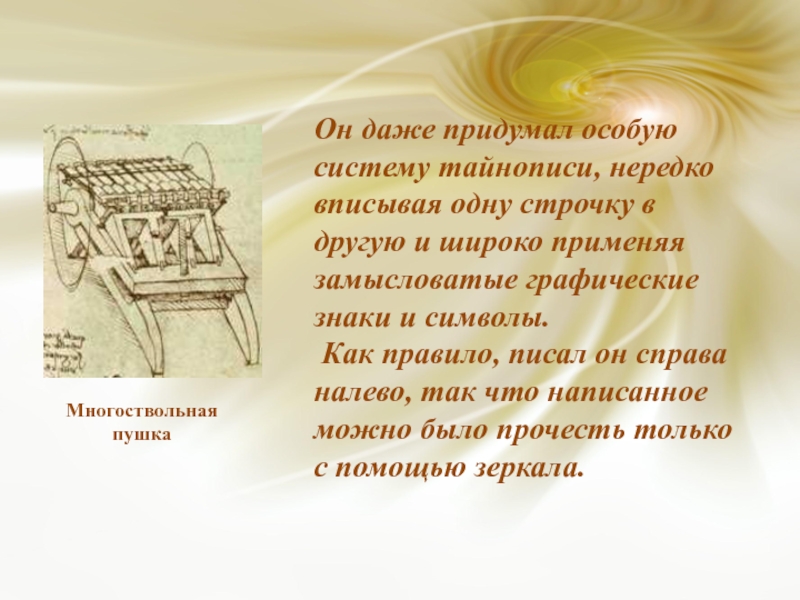 Он даже придумал особую систему тайнописи, нередко вписывая одну строчку в другую и широко применяя замысловатые графические знаки и символы. Как правило, писал он справа налево, так что написанное можно было прочесть только с помощью зеркала.