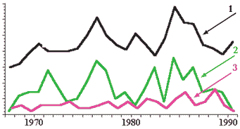 РИС. 2 Число аварий в энергосетях США в районах повышенного риска (близких к авроральной зоне) возрастает вслед за уровнем геомагнитной активности. В годы минимума активности вероятности аварий в опасных и безопасных районах практически уравниваются. 1. Уровень геомагнитной активности 2. Число аварий в геомагитно – опасных 3. Число аварий в безопасных районах