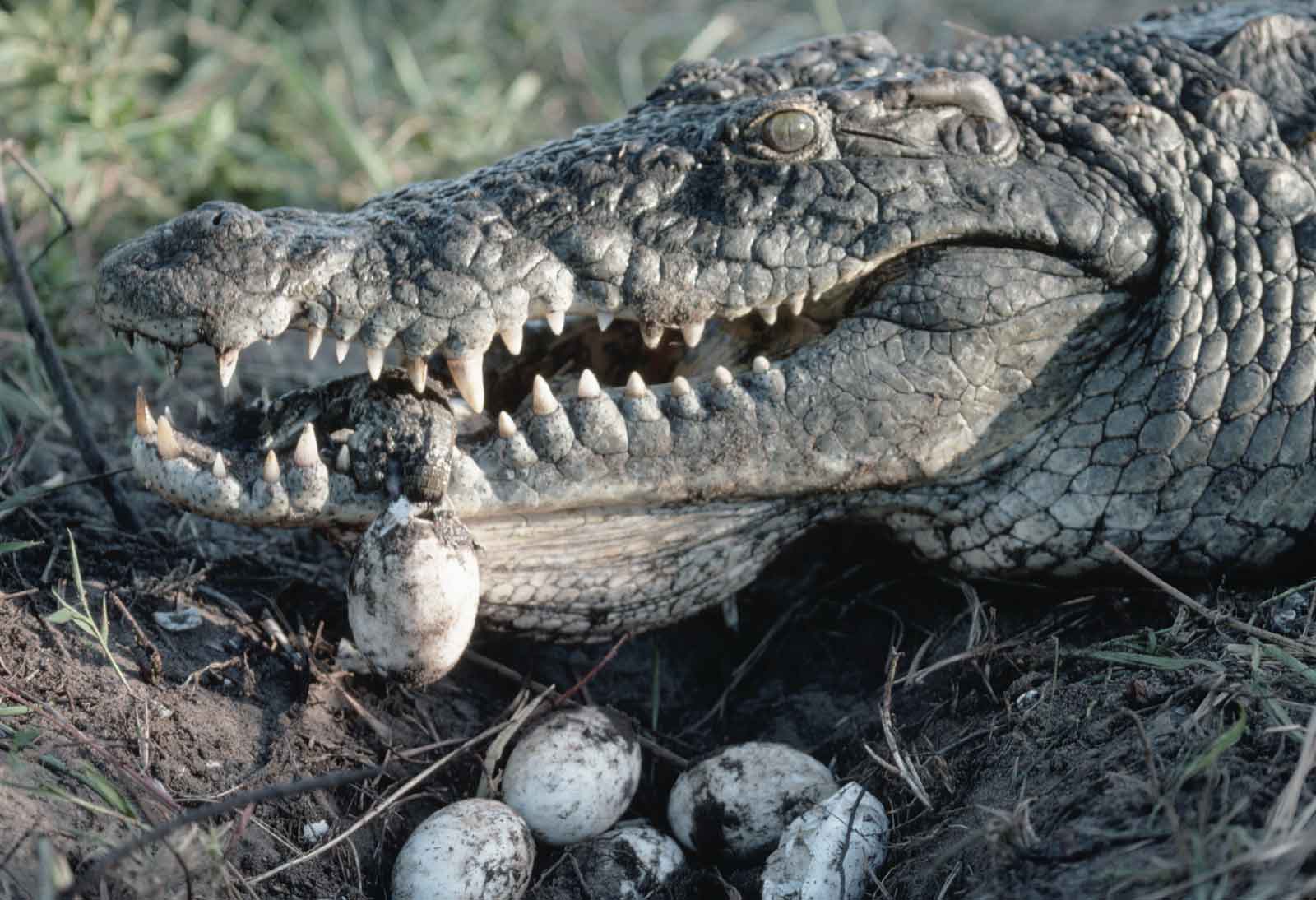 Детеныши нильского крокодила рождаются в самом низу пищевой цепи – любой может их съесть. Самка переносит из гнезда своих детенышей в пасти к ближайшему водоему. Хрящи, расположенные в пасти матери, позволяют блокировать челюсть в любой момент закрытия и регулировать напряжение. Самка может даже заблокировать пасть, раскрытую всего на 5 см, что позволяет переносить до 20 детенышей за раз, ни разу не укусив их.