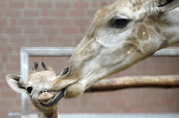 Рождение жирафёнка - радостное событие для всего стада. Появившегося на свет жирафёнка, каждый взрослый нежно приветствует прикосновением носа.