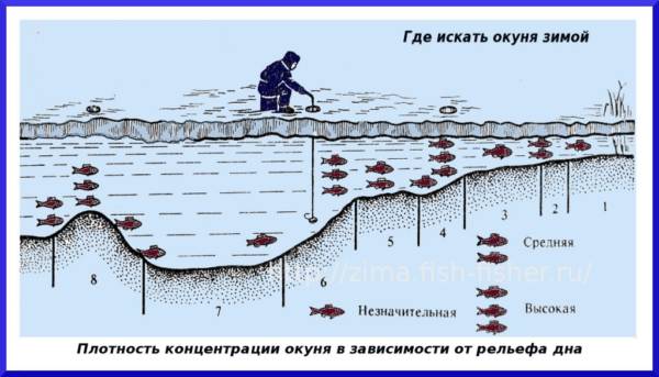 Поиск окуня зимой ведут не только исходя из особенностей его поведения. Каждый водоём имеет свою структуру строения, которую с удобством для питания используют стайки окуней. Так, отыскивая корм в прибрежной зоне, хищник старается держаться в редко поросшей водорослью зоне, где присутствуют перепады глубин от пару десятков сантиметров до полуметра. Именно на перепаде глубин крупные горбыли выслеживают рыбью мелочь.