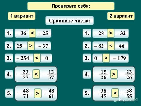 Математический диктант 1 вариант 2 вариант Сравните числа: – 36 – 25 1. 25 – 37 2. – 254 0 3. – 28 – 32 1. – 82 46 2. 0 – 179 3. < 4. 23 57 – 12 57 – 4.
