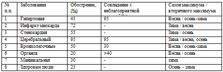 Таблица 2. Метеотропные изменения, обострения (%) у больных и здоровых людей по сезонам в условиях Центральной Росси (Исаев А.А. 2003)