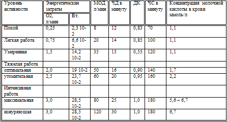 Таблица 7. Энергетические затраты и реакции систем дыхания и кровообращения при различных уровнях активности (Физиология человека, 1985)
