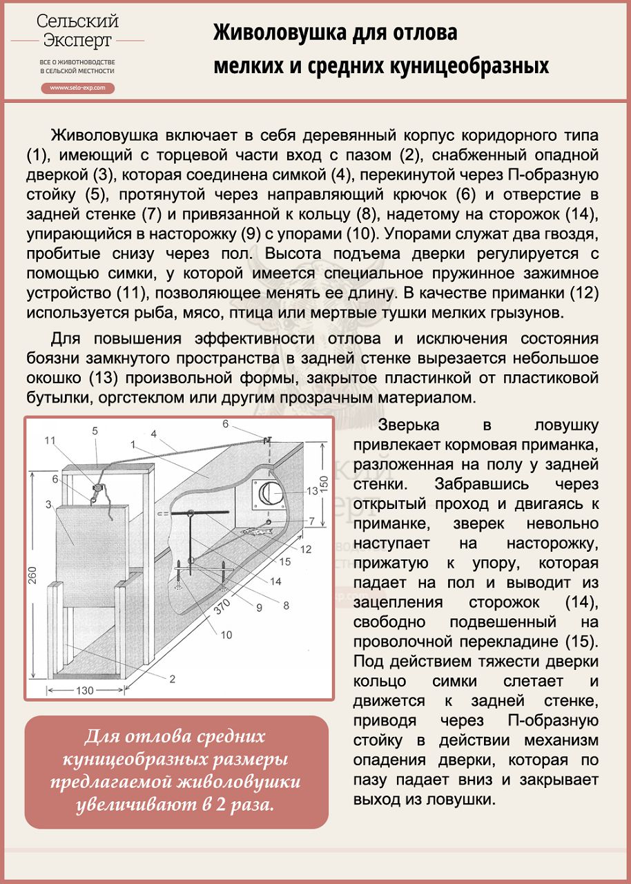 Фермеры с умелыми руками вполне могут поймать хищника живым в самодельную ловушку. Понадобится клетка или ящик, размером подходящий для хорька. Дверца должна быть захлопывающаяся. Внутрь клетки помещается лакомство – часть тушки курицы. Дверцу следует устроить таким образом, чтобы она захлопывалась в тот момент, когда зверь схватит мясо.
