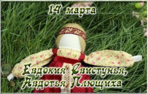 Согласно церковным традициям на 14 марта выпадает праздник святой Евдокии, которая является мученицей. Среди народа распространены и другие ее имена: Весновка, Плющиха (ведь снег начинал таить и сплющиваться) и Свистуха (поскольку начинает дуть теплый ветер). Считается, что день Евдокии – начало весны, поэтому в древности люди в обязательном порядке отмечали этот праздник, зазывая в свой дом тепло, благополучие и счастье. Кроме этого, этот праздник у наших предков считался новым годом, поскольку в то время он припадал на 1 марта по старому стилю.