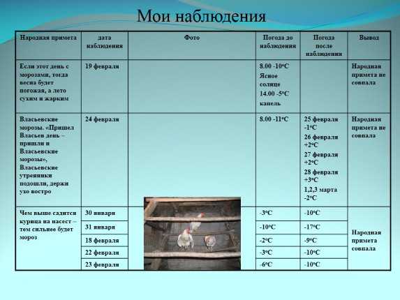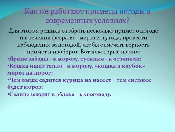 13 4 примета. Если 5 сентября на Лупа - брусничника не будет утренника, так в сентябре не заморозит. Примета оказалась верна. 5 примета. Если полетят журавли в день 30 сентября, то на Покров будет мороз; если нет, то холод придет позднее.14 октября2015г. мороза не было. Примета подтвердилась. 6 примета. 30 ноября Григорий. Этот день указатель зимы: каков он, такова и зима будет. Примета подтвердилась. 7 примета. Если животные прячут нос, значит, надвигаются морозы. Эту примету я наблюдала по своей кошке. Примета верна. 8 примета. Кольцо вокруг луны - к ветру. В проверяемые дни примета не подтвердилась. 9 примета. На Ефима метель (2 февраля) - всю неделю «прометелится». Примета не подтвердилась. Итак, из 9 примет верны 6, а 3 приметы не сбылись. Мы можем сделать вывод, что современные люди не смогут обойтись без синоптиков, так как народные приметы не всегда верны. Я взял под наблюдение несколько доступных примет для определения погоды на ближайшее время и в течение месяца следил за поведением животных и комнатных растений. Мои наблюдения и прогнозы народных примет совпали в 9 случаях из 10. Я наблюдала за комнатными растениями в классе и дома, убедилась, что некоторые растения (диффенбахия, монстера) действительно «плачут» перед осадками. Наблюдала за кошкой и воробьями. Перед морозом моя кошка сворачивается клубочком, прячет мордочку в шерсть и ложится ближе к печке, а перед теплом она лежит, раскинув лапы, на полу или диване. Воробьи перед морозом прятали голову под крылышко. Вывод: поведение животных подтвердило некоторые народные приметы.